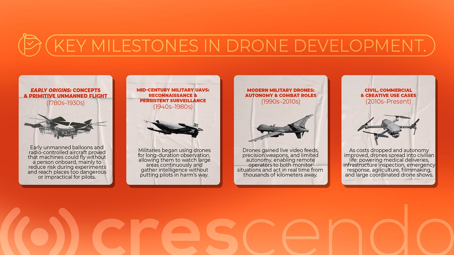 Over time, these ideas evolved in small but meaningful steps. Early experiments focused on simply keeping machines airborne, but as aviation matured, balloons became aircraft and mechanical controls gave way to electronics. Manual piloting was gradually supplemented with basic automation, such as self-stabilizing flight and waypoint navigation, which made drones easier to operate and more consistent in performance.