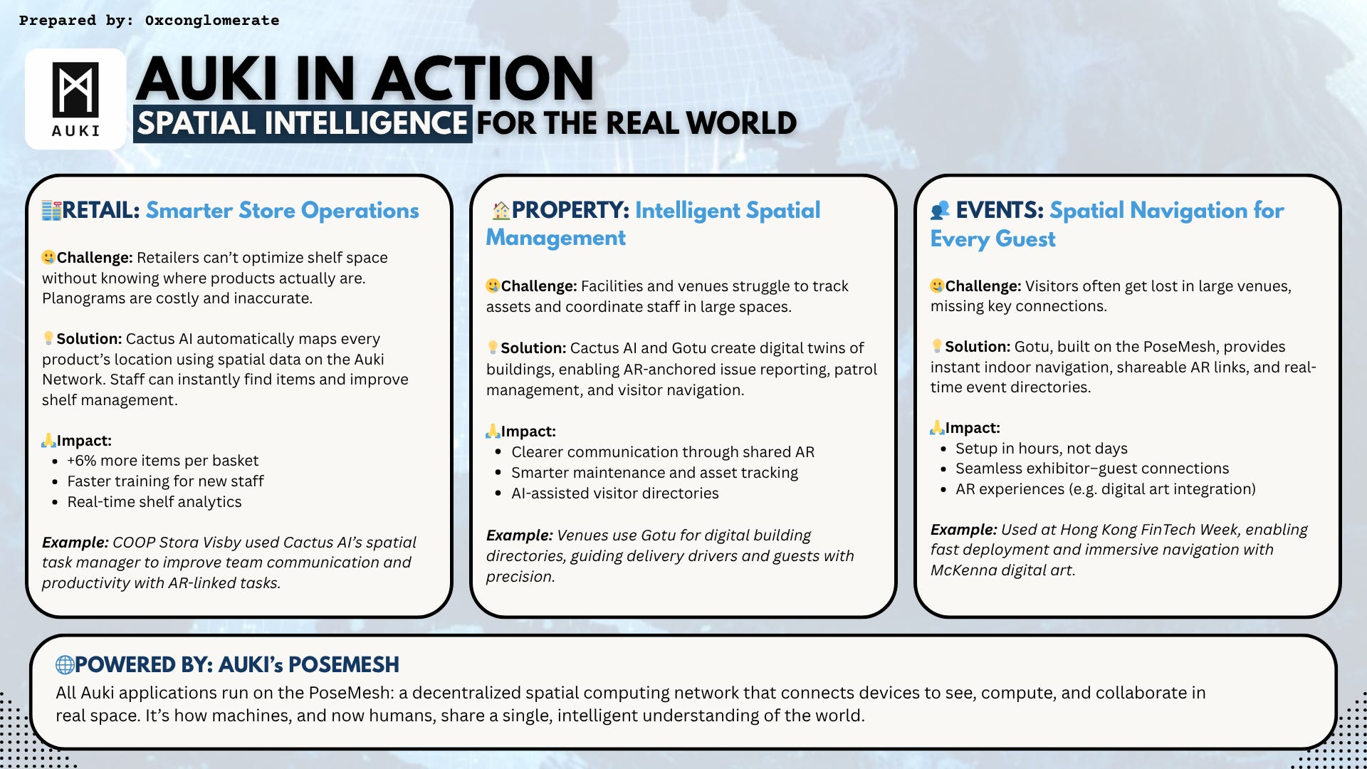 Across industries, Auki is already proving how the posemesh transforms physical environments into intelligent systems. Retailers use it to track products in real time, property managers to coordinate teams through shared AR overlays, and event organizers to guide thousands of visitors seamlessly through complex venues.